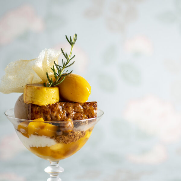 まさしく贅沢な桃づくしのパフェ。メルバソースでまたもうひとつの味わいも愉しんで。…