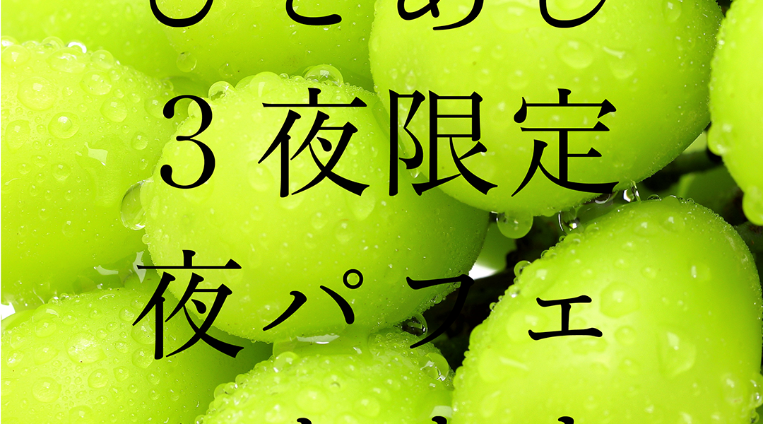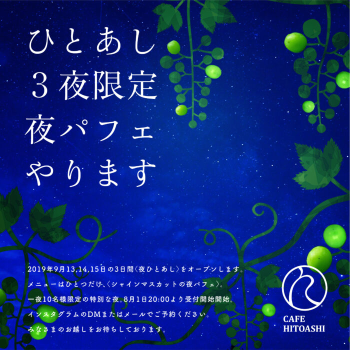 2019年9月13,14,15日の3日間〈夜ひとあし〉をオープンします。メニューはひとつだけ、〈シャインマスカットの夜パフェ〉。一夜10名様限定の特別な夜。8月1日20:00より受付開始開始。インスタグラムのDMまたはメールでご予約ください。みなさまのお越しをお待ちしております。
