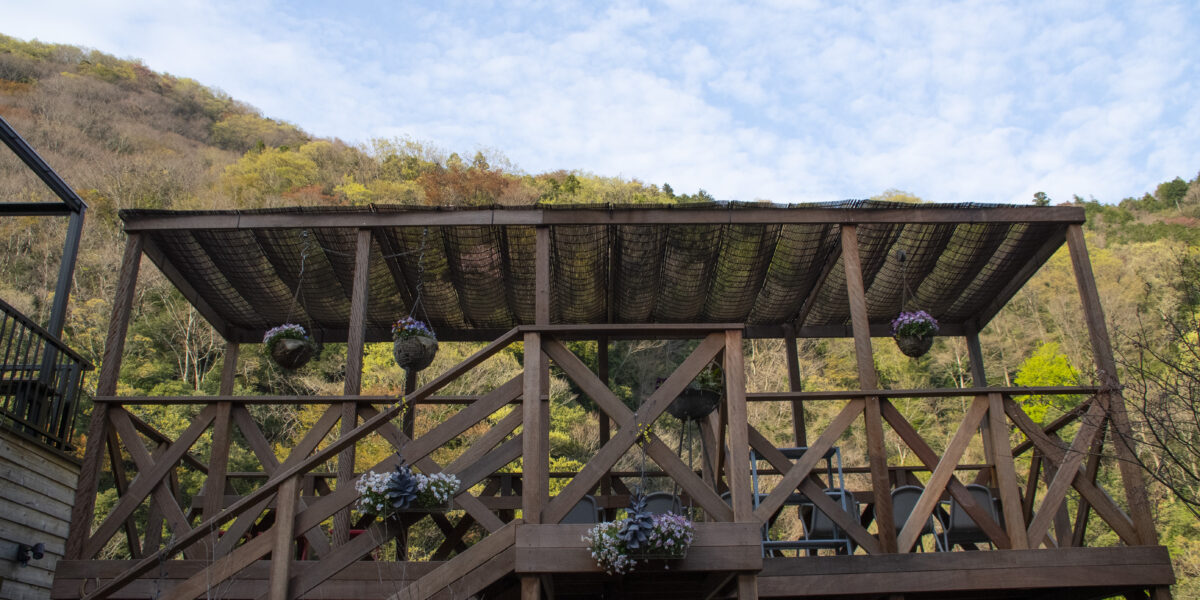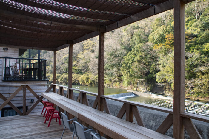 当店には中津川と山が一望できるテラス席があります。ペットをお連れの方はもちろん、川を眺めながらパフェを楽しみたい方もどうぞ。冬季と春先はかなり寒いのでブランケットをご用意しています。新緑がまばゆい頃、紅葉の季節と、自然の景観をお楽しみください。