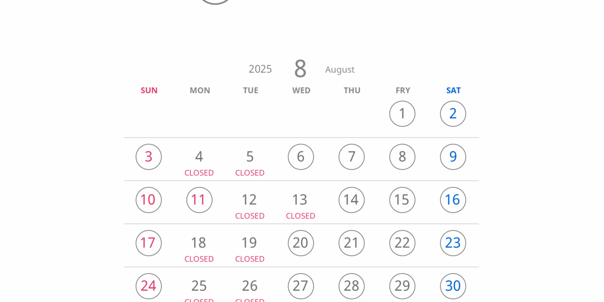 8月のスケジュールをお知らせいたします。お暑い中お気をつけてお越しください。