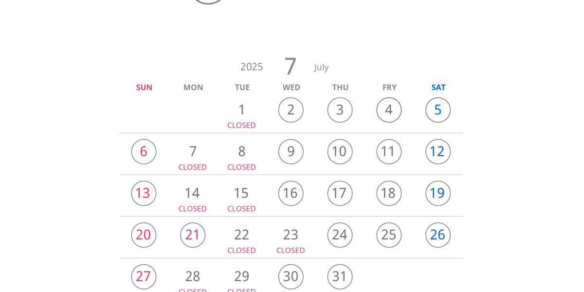 7月の営業スケジュールをお知らせいたします。連日熱暑となっております。お気をつけてお越しくださいませ。