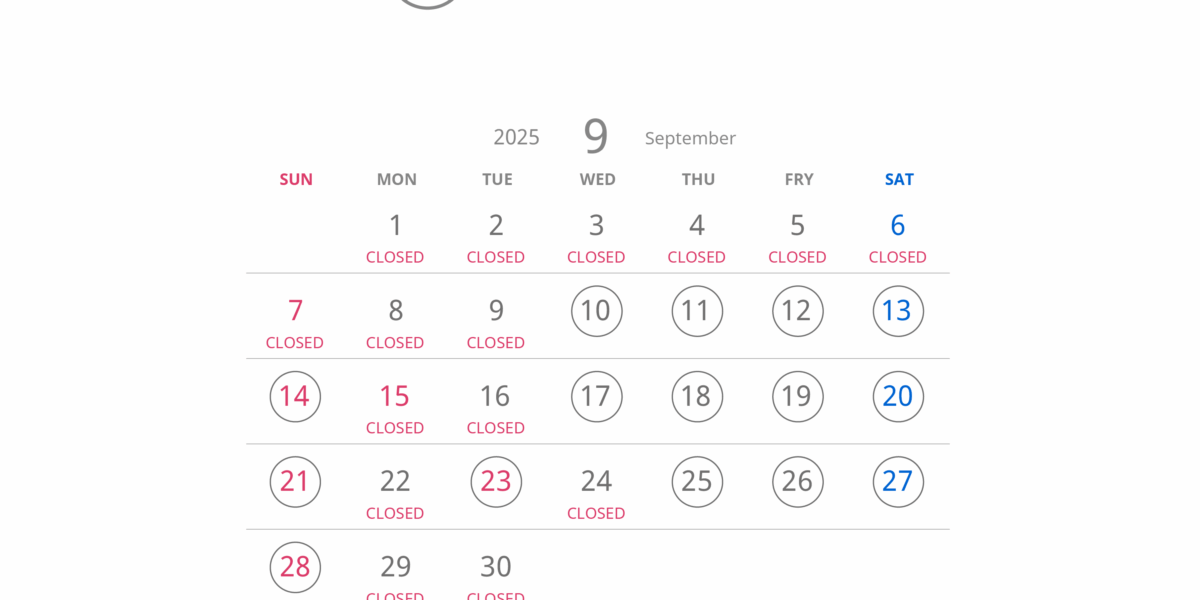 9月の営業時間をお知らせします。1日〜8日は夏季休業となっております。ご不便をおかけいたしますがどうぞよろしくお願いします。