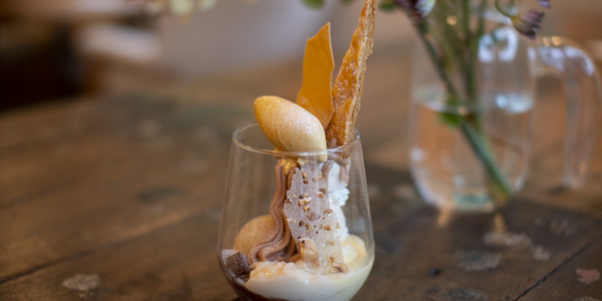 ここ数日夜が涼しくなって、お店の前の山に秋の彩りが増えてまいりました。9月27日より〔栗とナッツのパフェ〕が始まります。贅沢な素材を濃厚な甘さに仕上げた秋のパフェ。ほろ苦い焦がし醤油のキャラメルアイスとマロンの風味は相性抜群です。甘さ、食感、風味すべてのバランスが絶妙な大人のためのパフェをぜひお召し上がりください。