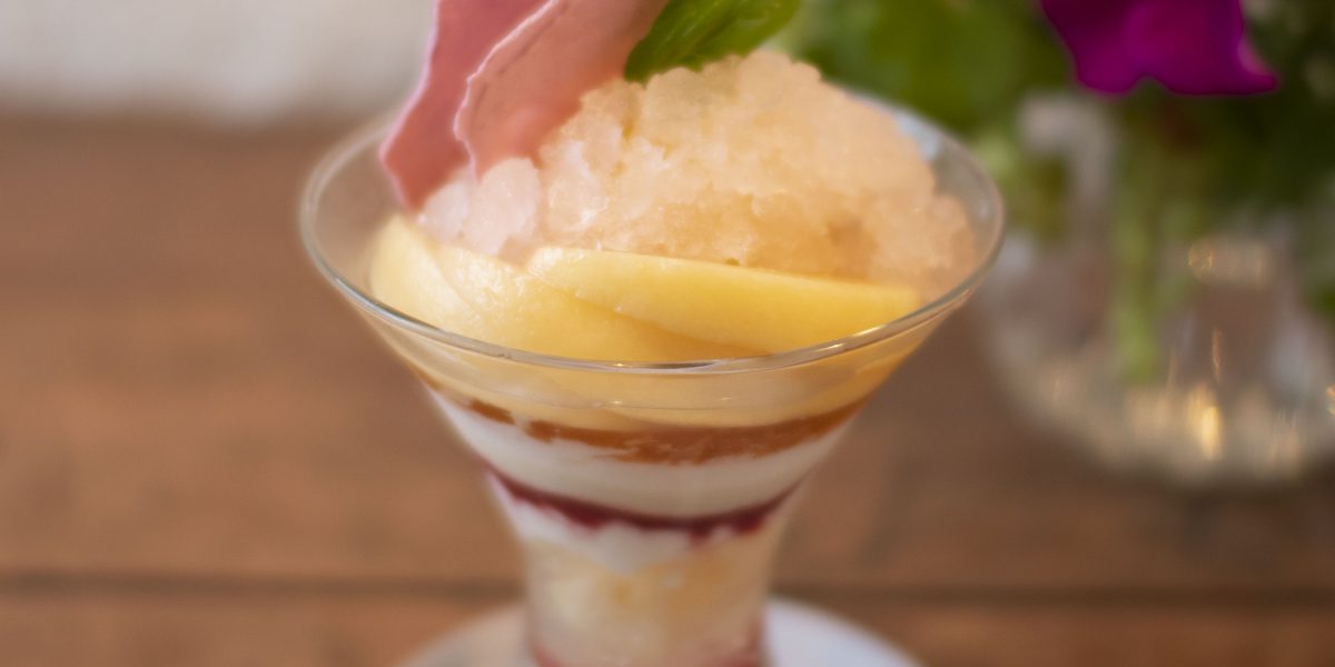 先月よりご提供しておりました”メロンとミントのパフェ”がは7月10日(水)で終了になります。そして11日(木)より”桃とバジルのパフェ”が始まります。