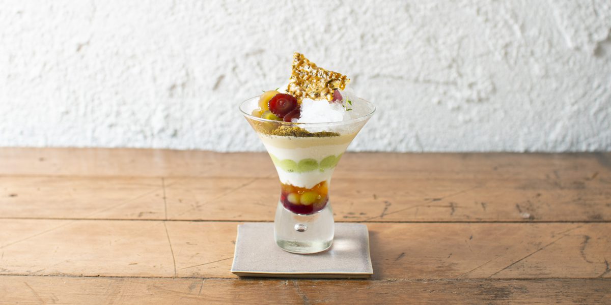 桃と紫蘇系を合わせた大人の桃パフェ。ライチとベルガモットの塩ソルベがアクセントになっています。いつもの桃デザートとはひと味違う仕上が…