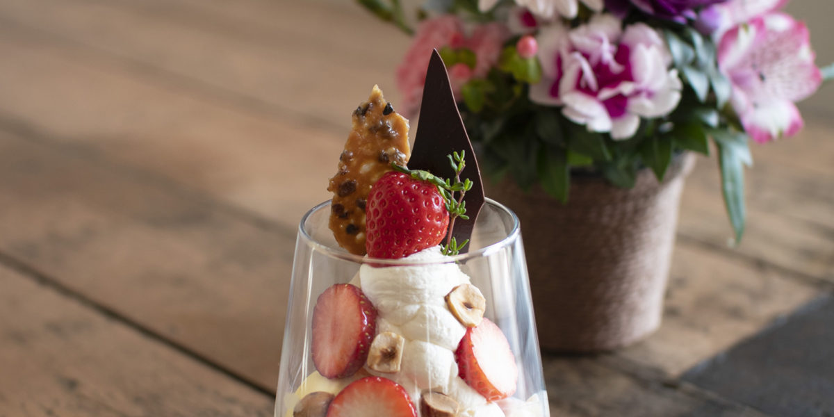 桜が散り、山々が眩い新緑へと移りゆく変化をパフェでも感じていただきたい。その思いからこのパフェは"桜のパフェ"をオマージュした盛り付けと…