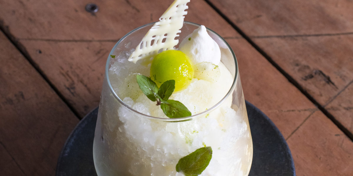 初夏を感じる爽やかで冷たいパフェです。チョコレートの飾りでメロンの模様を連想させたり、数種類の氷菓子をグラスに詰め込みました。フレッシュのミントも一緒にお召し上がりください。2020.7.30ご提供終了しました。