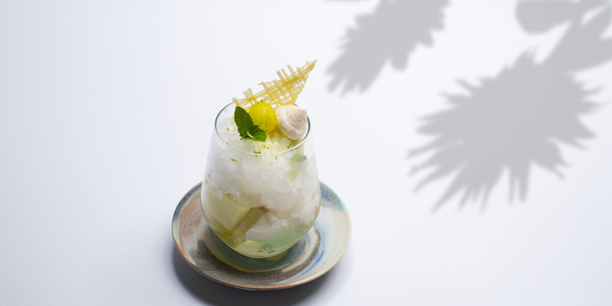 メロンをはじめ緑の素材をアレンジして初夏を表現しました。キウイ、きゅうり、わさび、ライム、バジル、ミント。すべての緑が爽やかなパフェ…