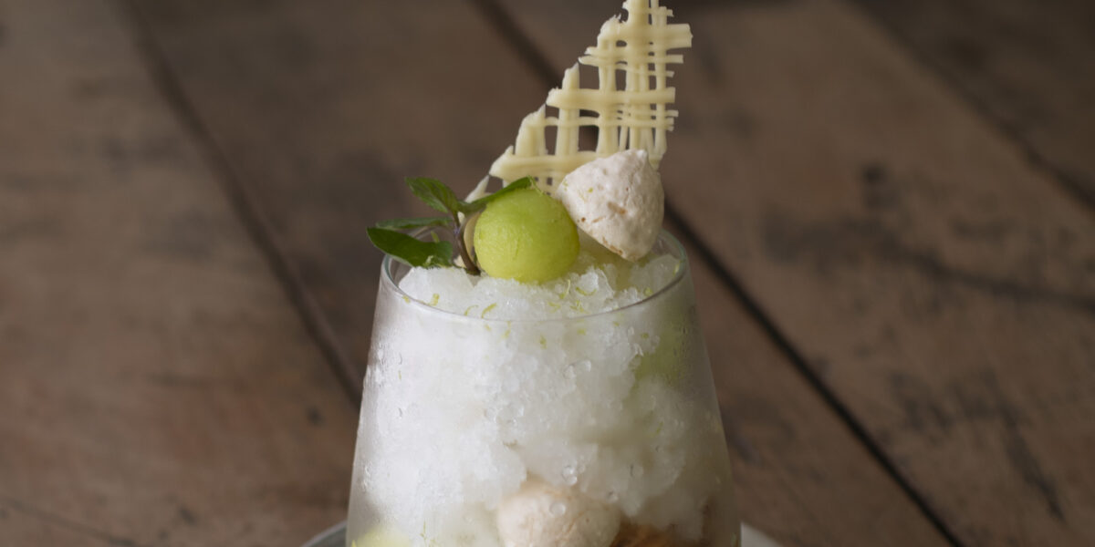 至高のシャインマスカットをメインにレモンやジンジャーなど爽やかな素材を使いました。ジンジャーエールのアイスはスパイスの効いた逸品。…