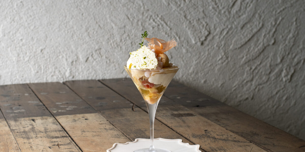 トマトのアイスや生ハムなど、ちょっとおもしろい素材とあわせたみずみずしい桃のパフェ。