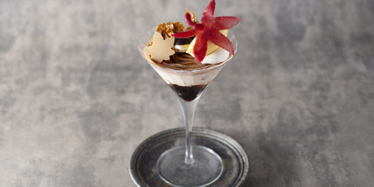 今年の〈栗とナッツのパフェ〉は器が変わっての登場です。贅沢な素材を濃厚な甘さに仕上げた秋のパフェです。 ほろ苦い焦がし醤油のキャラメルアイスとマロンの風味は相性抜群。甘さ、食感、風味すべてのバランスが絶妙な大人のためのパフェをお楽しみください。2021年最後のパフェです。