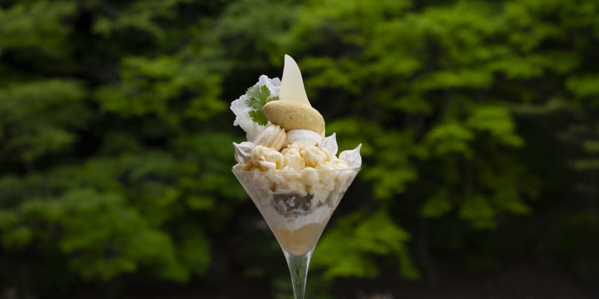 桜が散り、山々が眩い新緑へと移りゆく変化をパフェでも感じていただきたい。その思いからこのパフェは"桜のパフェ"をオマージュした盛り付けと…