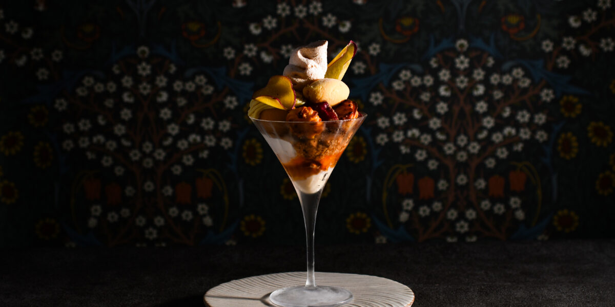さつまいもをモチーフにした秋のパフェです。スイートポテトや大学芋、自家製さつまいもモンブランにアイス、さらに秋の果実も加え、様々なアレンジをお楽しみ頂ける一品に仕上げました。