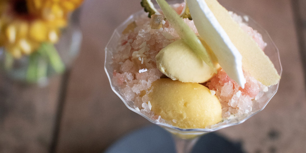 フレッシュな桃と優しいミルキーな後味が印象的な夏パフェです。ハーブの爽やかさとビールの苦味がアクセントに。メルバソースはお好きなタイミングで…